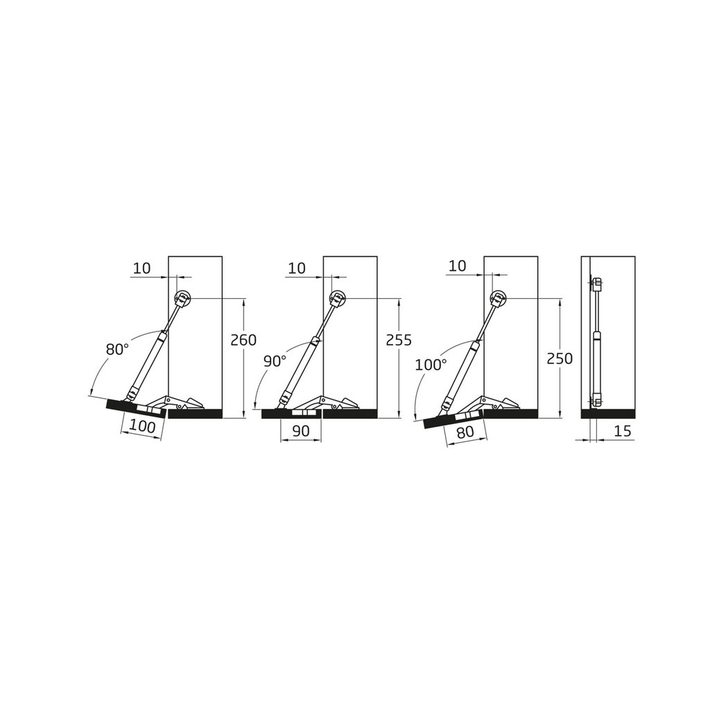 Bisagra hidráulica con amortiguador de gas pistón de bajada de 100N de fuerza y con compás abatible ideal para puertas de armario y para muebles. Este pistón de bajada ayudará a que la caída de la puerta sea amortiguada y silenciosa.