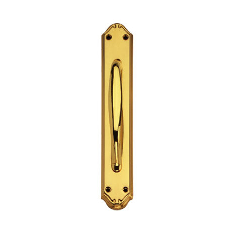 Tirador con placa y asa centrada en la misma. Su acabado es latón pulido.Producto: Tirador