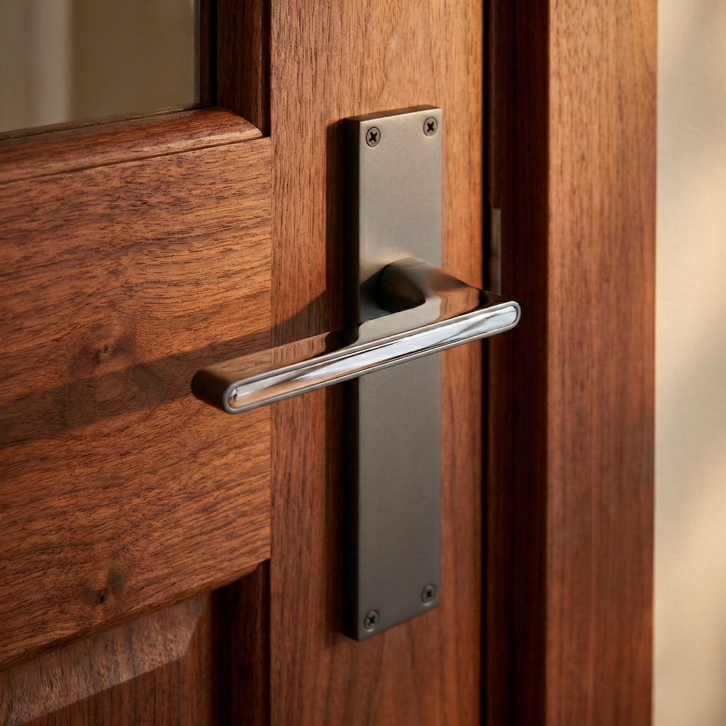 Conjunto de puxadores (2 puxadores; 1 puxador para cada lado da porta) com placa retangular em zamak acabamento grafite para portas interiores. Essa alça é um dos nossos melhores novos recursos. O seu design elegante e cheio de detalhes confere às suas portas um toque vanguardista e moderno. Além disso, é uma maçaneta de alta qualidade capaz de suportar muita intensidade de uso, então o que você está esperando para renovar as maçanetas das suas portas?