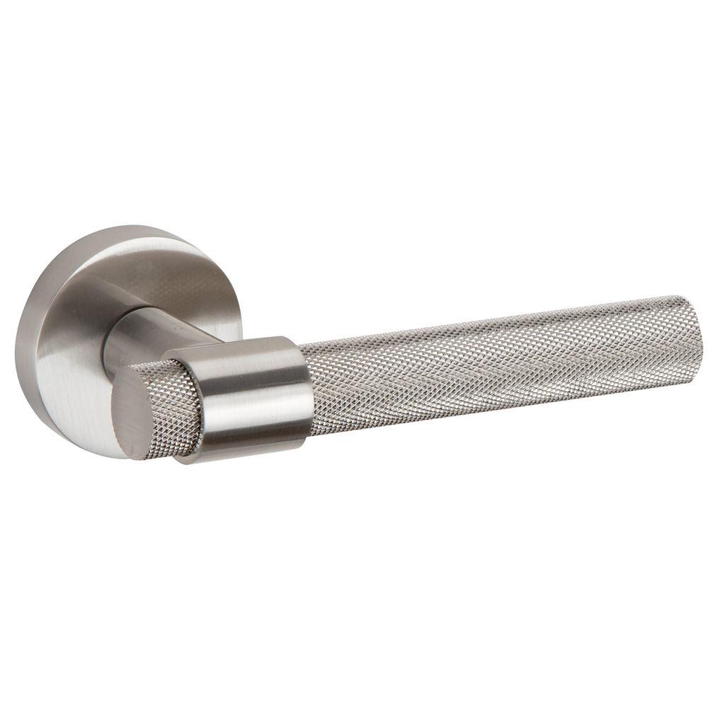 Juego de roseta redonda acabado en níquel satinado para puertas de madera de interior.